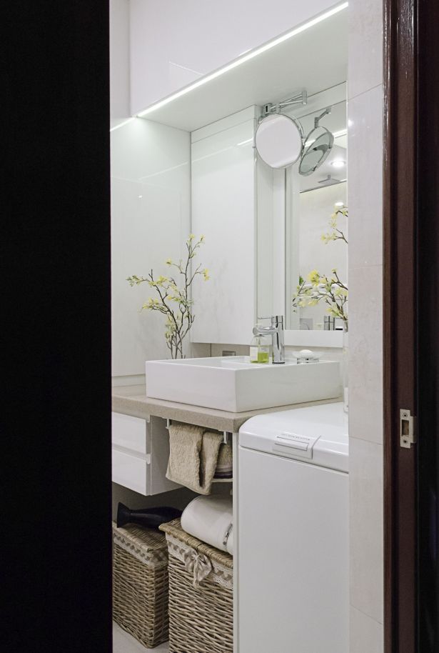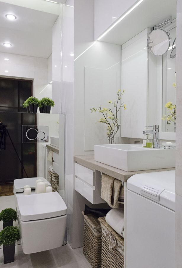 Мы отделили метровую зону белой перегородкой, что позволило избавиться от эффекта уменьшения пространства гостиной. Органичные раздвижные двери едва заметны на общем фоне, поэтому не отвлекают внимания гостей от жилой части помещения.