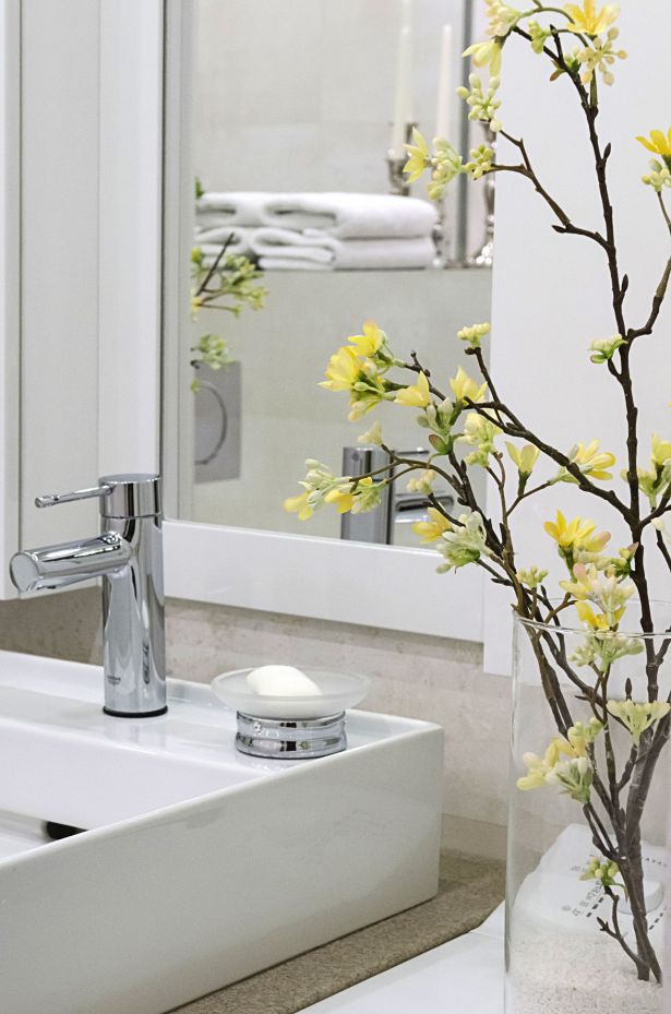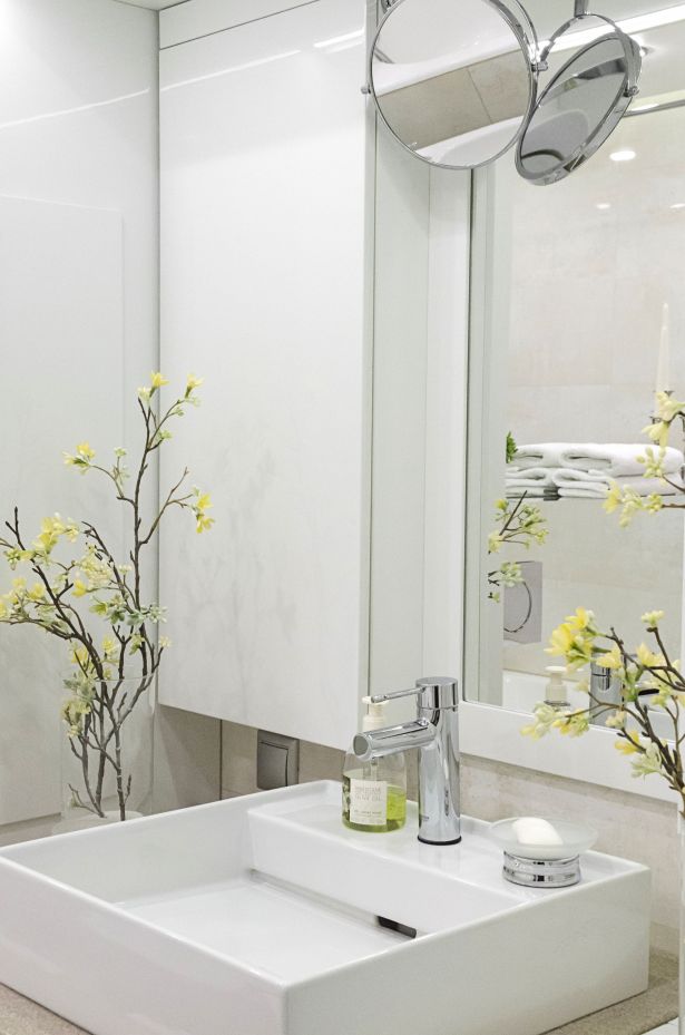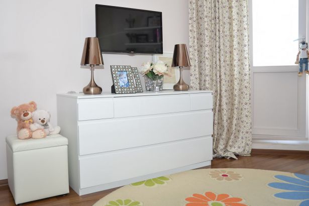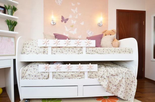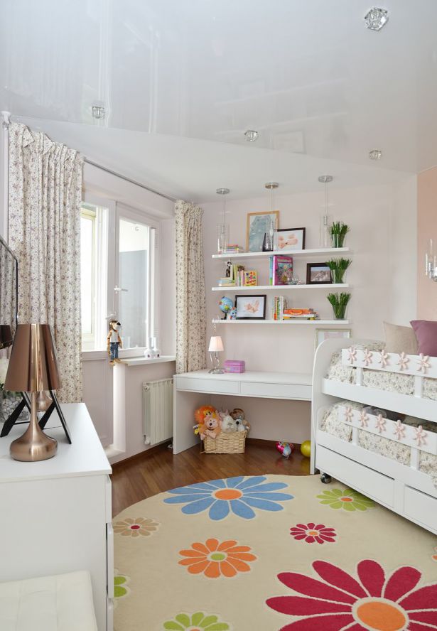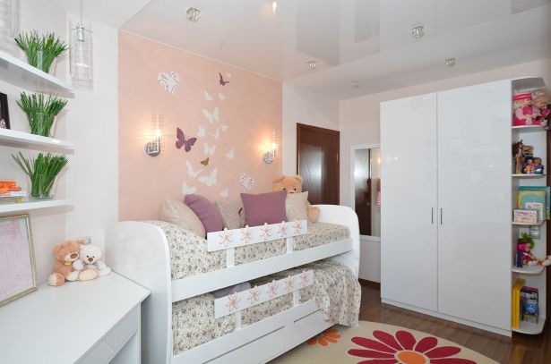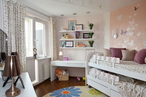 Особое внимание я уделила детской комнате. Две маленькие принцессы имеют все необходимое для досуга, отдыха и обучения: личные письменные столы, шкафы и кровати. Спальные места организованы по типу «2 в 1» – нижняя часть задвигается, чтобы освободить дополнительное пространство. Концепция естественной освещенности поддерживается неброскими потолочными лампочками, бра и светлыми тонами стен. Трендовый сегодня кипенно-белый тон является цветовой доминантой в мебельном ансамбле, визуально расширяя пространство и создавая атмосферу чистоты и свежести. Думаю, малышкам придется по вкусу идея украсить пространство возле кровати изображениями трепещущих бабочек.