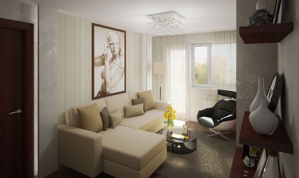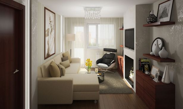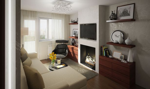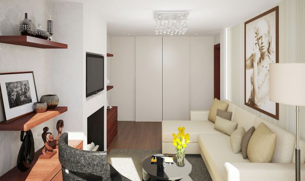 У окна расположили удобный угловой диван и современную картину за ним. Обои в вертикальную полоску на этой стене призваны визуально «поднять» потолок негабаритной комнаты. По бокам в монтированных коробах предусмотрена скрытая подсветка. При выключенном основном освещении она будет создавать атмосферу релакса. Напротив дивана идеально вписался в антураж уюта электрокамин, над ним – тончайший телевизор. По бокам в небольших нишах расставлены комоды и навесные полки с элементами декора и книгами. Такое решение позволило значительно сэкономить полезную площадь. Завершают композицию стильное кресло и торшер в стиле минимализма.