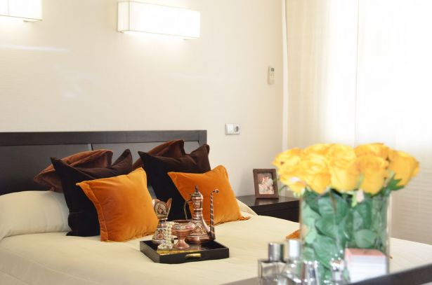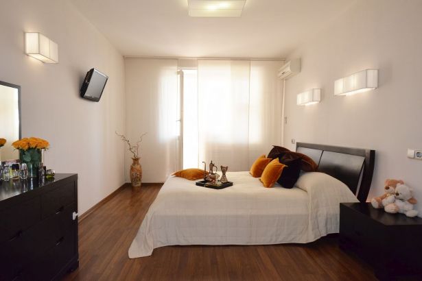 Спальня родителей получилась такой же интересной и просторной, как другие комнаты за счет светлой отделки и минимизации мебели. Главенствующее место в ней заняла большая кровать, изготовленная из древесины темных тонов.