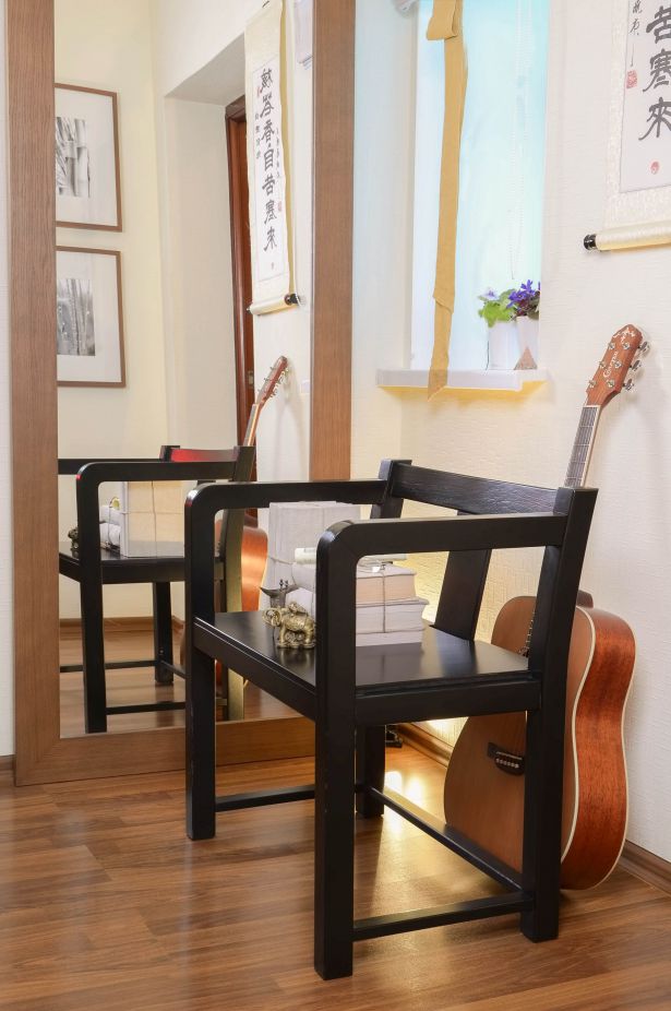 - Японский стул из темного дерева, на котором разместились книги и ноты.