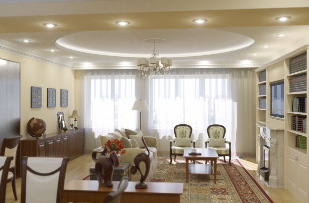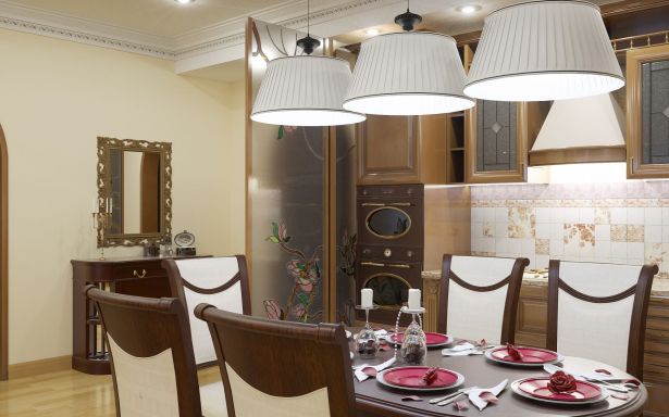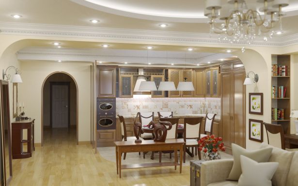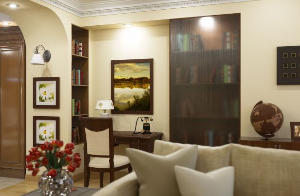 Трудились мы над обустройством квартиры в 150 м2. Получилась достаточно интересная планировка. В гостиной буквально можно играть в футбол, так много свободного пространства. А что еще нужно для семьи, где рядом с любящим отцом подрастают двое мальчишек? Визуальному расширению пространства поспособствовали и материалы в спокойных тонах, используемые для отделки: белоснежные потолки, бежевые стены и покрытие пола под светлое дерево. Все это отлично сочетается с мебелью и светильниками в классическом стиле, выбранными нами для обустройства дома. Никакой вычурности и излишеств, только строгие сдержанные линии, качественные материалы и атмосфера непередаваемого уюта.