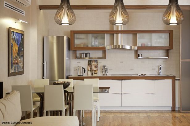 Особый интерес для нас представляла кухонная зона — большое просторное помещение. Так и тянулись руки использовать это пространство в качестве рабочего кабинета. Фантазия велика, однако мы ограничены требованиями СНиПов, которые запрещают сантехническим элементам находиться над жилыми комнатами. Как же распределить практично и эстетично пространство? Кухня была совмещена с гостиной, в качестве разделителя зон выступил обеденный стол. Кухонный гарнитур мы выставили в 1 линию, спрятав их за раздвижными дверями.