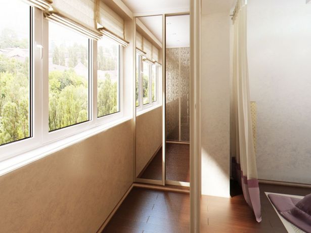 Балкон утеплили и разместили там шкафы-купе. В одном из них, кстати, спрятался рабочий стол, и даже книжные полки. Зеркальные дверцы расширили пространство.