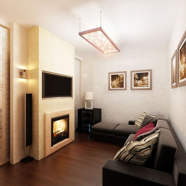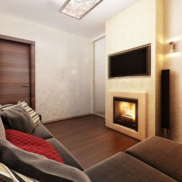 - В общественной зоне поставили небольшой удобный диван, музыкальный центр, телевизор и даже электрокамин. На потолке — люстра, заполняющая комнату мягким светом. Получилось отличное место для приема гостей.